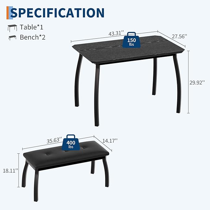 GAOMON Dining Table Set for 4, Metal Frame Kitchen Table Set with 2 Upholstered Bench, 3 Piece Dining Room Table Furniture for Apartment, Studio, Home, Easy Assembly, Black