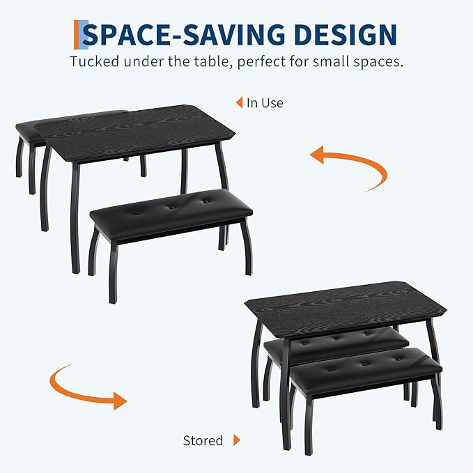 - Tuck-Away Benches for Space Efficiency: Designed with small spaces in mind, both upholstered benches conveniently tuck under the dining room table, maximizing your floor space and keeping your dining area neat and clutter-free when not in use