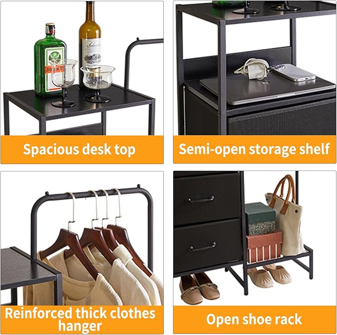 - 1.3-in-one multifunctional design:This multifunctional small clothes rack integrates a clothes hanger, storage drawer cabinet and shoe rack in one, which is compact and efficient, providing an integrated solution for small spaces and maximizing space utilization. Whether placed in the bedroom, porch, living room or closet, this multifunctional clothes rack can meet your storage needs while improving the functionality and beauty of the space