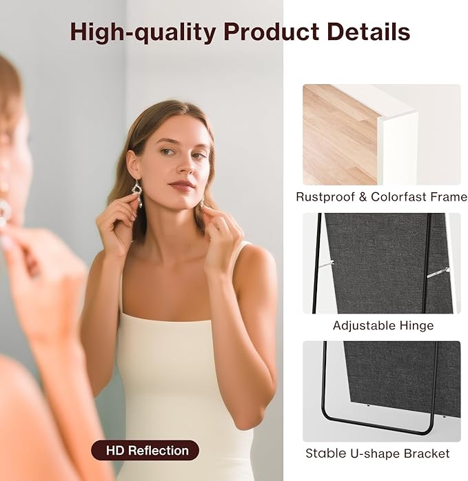 - 🛠️【Adjustable & Stable】: Versatile U-bracket allows tilt adjustment. Lean the floor mirror securely against walls, free stand anywhere or wall mounted - perfect for tight spaces