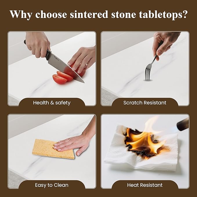 - Sintered Stone Dining Table Top: The modern kitchen table top is not only visually stunning but also highly practical. Crafted from a hardwearing sintered stone material, it can offers better exceptional resistance to scratches and heat than marble dining table top.