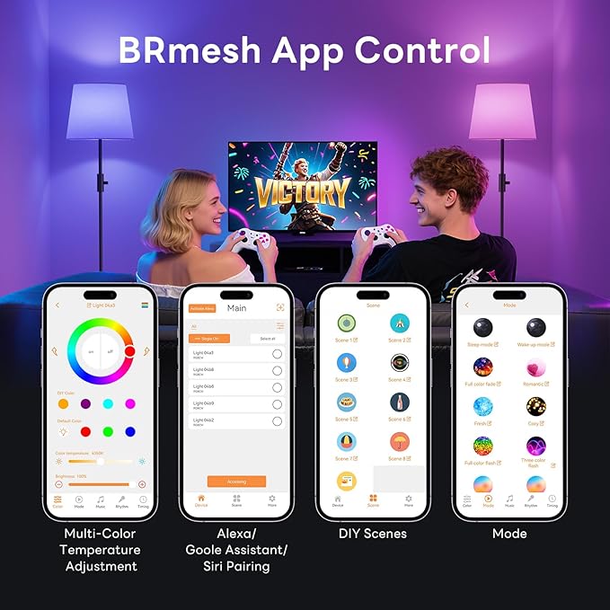 - Create Personalized Lighting Scenes: For enhanced lighting control, the BRmesh app offers expanded functionality, including access to the full RGB+CCT spectrum, dynamic modes, music synchronization, and DIY personalized scenes. No registration required; you can create and activate custom lighting combinations (color/brightness) with a single tap. A timer can also be used to schedule LED light commands: on/off, color, color-changing modes, gradients, and more.