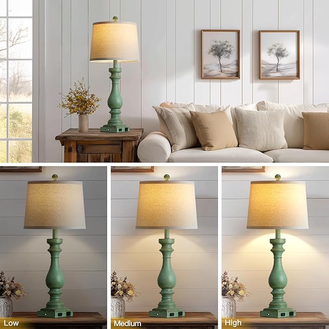 29" Tall Vintage Table Lamps Set of 2,Retro Green Bedside Lamps with USB C+A Ports & AC Outlet,3-Way Dimmable Touch Lamp for Night Stands Living Room Bedroom,Green