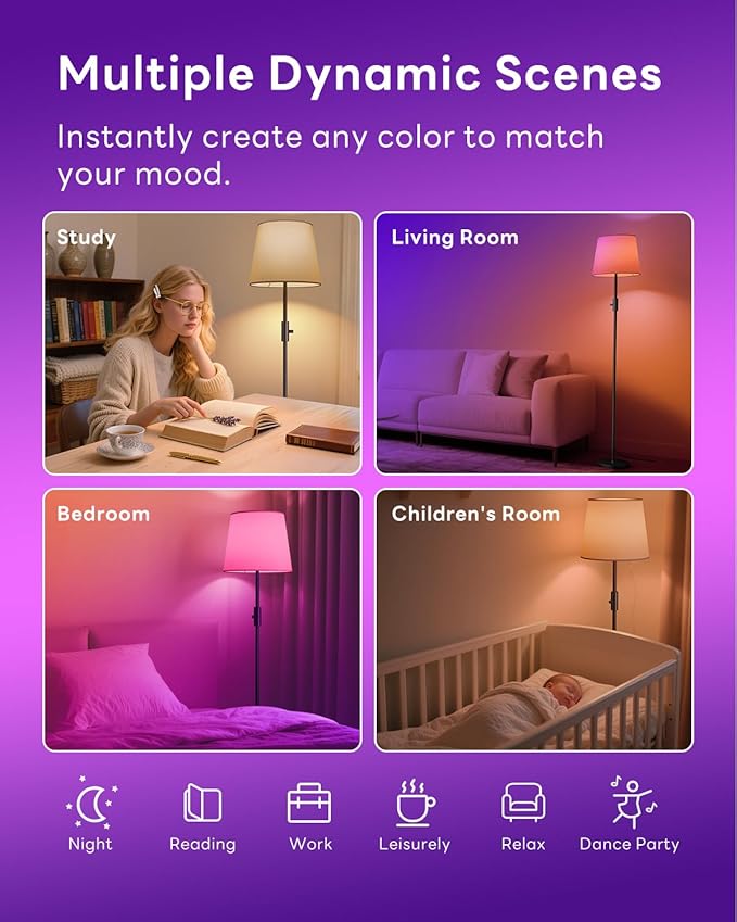 - Create Personalized Lighting Scenes: The floor lamp for living room included bulb offers nine static light colors, three dynamic modes (Party Strobe, Soft Color Smooth, Romantic), three preset modes (Comfort, Cool, and Soft). Dimmable from 0 -100%, it's perfect for holiday gatherings, movie nights, and romantic evenings. When you need to create your own unique lighting atmosphere, Create and activate your own custom lighting (colors & brightness) with the remote's one-touch DIY preset button.