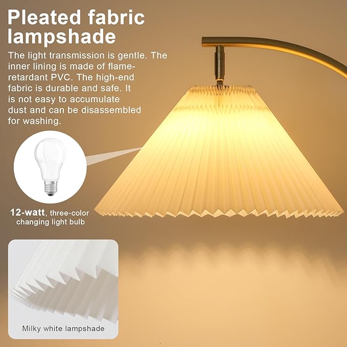 Unique Arc Floor Lamp, Bright 12W Three-Color Dimming, 14-inch Pleated Lampshade, Brass Gold Light Pole, Living Room Corner Bedroom Bedside Office Standing Reading Lamp, Modern Home Decor Tall Light
