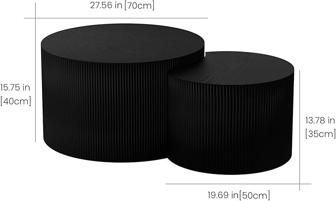 Round Nesting Coffee Table,Modern Fluted Coffee Tables Set of 2, Circle Vertical Stripe Design Drum Center Table Crescent Side Accent and Tables for Living Room (Black)