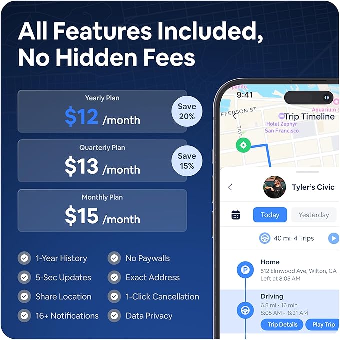 - Special Feature : Crash Detection Alerts, Speed Alerts, Geofence Breaches, Tamper & Unplug Notifications, Curfew Alerts, Driver Behavior Score, Plug-and-Play Setup, No Wiring or Tools, Compact OBD-II Design, Real-Time GPS Tracking, Address-Level Accuracy, Trip History, Animated Route Replays, Speed Monitoring, U.S.-Based Company, Secure Data Storage, 14-Day Free Trial, All Features Included, Simple Subscription Plans, Vehicle Diagnostics, Check Engine Codes (DTC), Fuel Level Monitoring, Battery Voltage, Engine Load Crash Detection Alerts, Speed Alerts, Geofence Breaches, Tamper & Unplug Notifications, Curfew Alerts, Driver Behavior Score, Plug-and-Play Setup, No Wiring or Tools, Compact OBD-II Design, Real-Time GPS Trac… See more