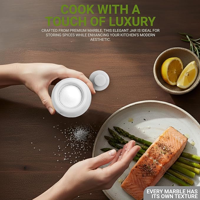 - Secure Lid for Freshness: Designed with a marble lid, this salt holder keeps ingredients fresh, dry, and protected from moisture. The easy to grip top allows for quick access during cooking, making it perfect for chefs who love both function and style in their kitchen tools.