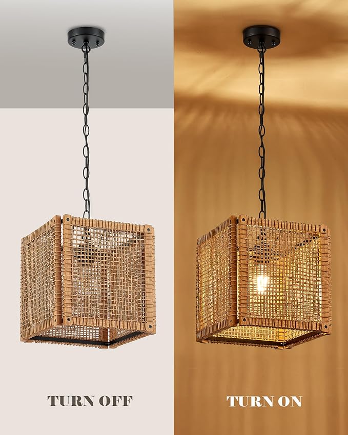 ELYONA 1-Light Rattan Pendant Light, 12" Square Solid Wood Frame Woven Pendant Light Fixtures Boho Adjustable Hanging Chandelier for Dining Room, Kitchen Island, Living Room, Bedroom, Bar, Hallway