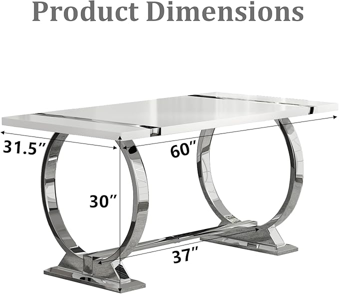 ACEDÉCOR 60in White and Silver Dining Table for 4-6, Modern Luxury Kitchen Room Table with Rectangular Lacquer Top and Silver Stainless Steel Circle Base