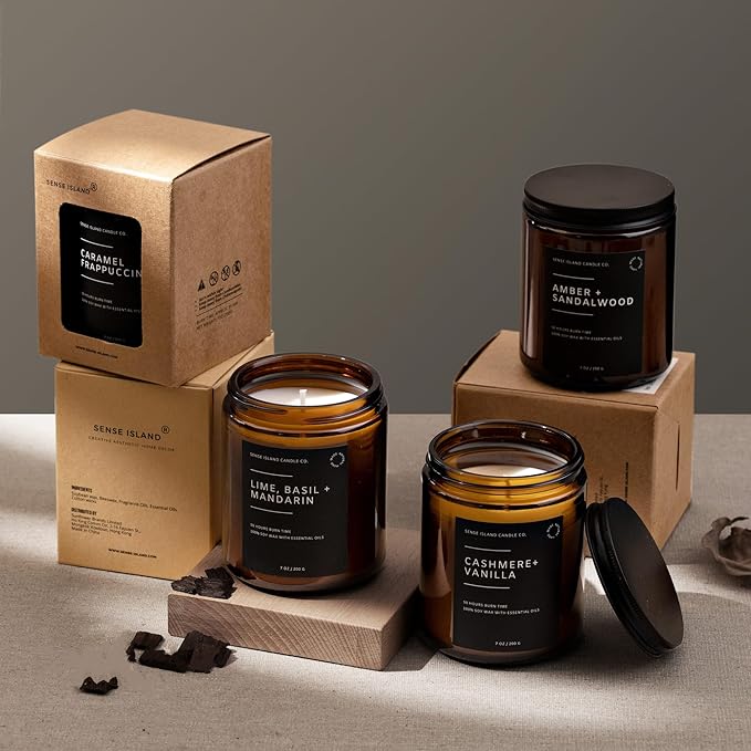 SENSE ISLAND Amber Sandalwood Scented Candles for Men&Women | Natural Soy Candle 7oz, up to 50 Hrs Burn Time Upgraded Formula for Authentic Sandalwood Aroma