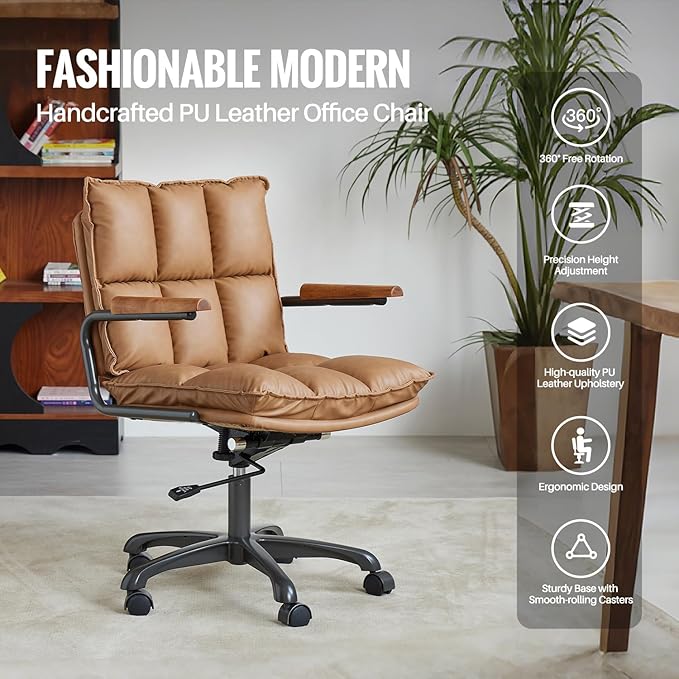 - Design-Forward Chair: Blending everyday function with artful style, this leather office chair works as both a comfortable home office chair and a modern décor piece. The smooth faux leather, warm mid-century silhouette, and refined stitching add texture and character to any workspace, making it a standout leather desk chair that elevates the entire room.