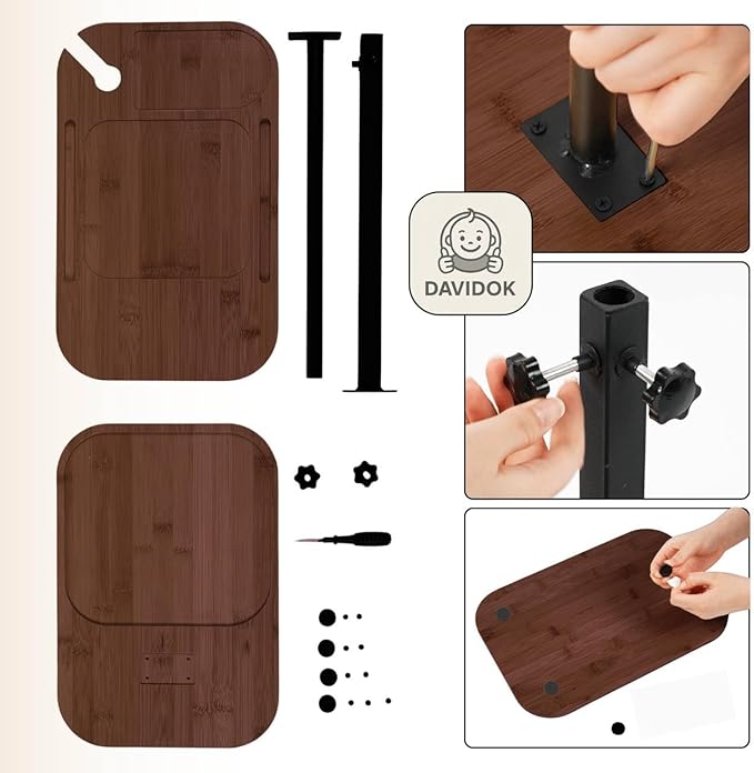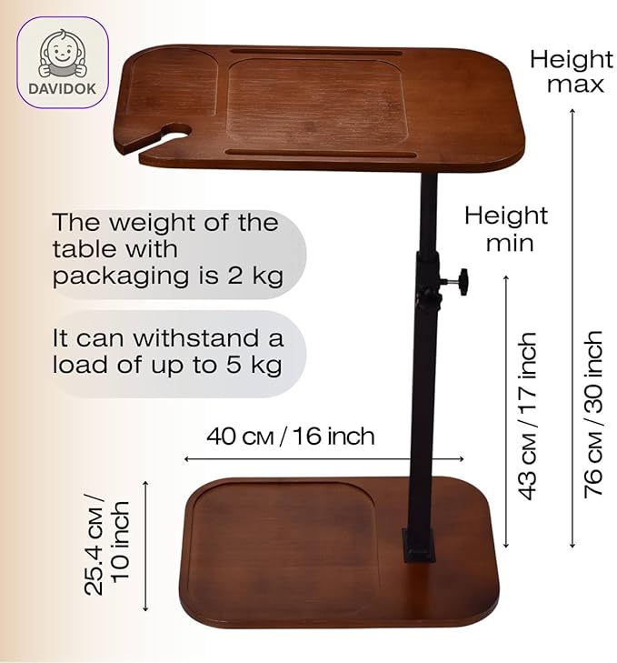 DAVIDOK C-Shaped Sofa End Table, Adjustable Height Couch Side Table with Device Slot, Brown Color with Black Metal Stand, Couch Table for Living Room, Bedroom