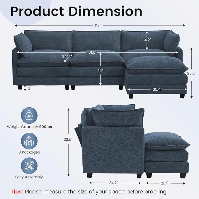- Delivered in 3 Separate Packages: Considering the large volume of product packaging, in order to meet practical needs and facilitate transportation, this 4-seater L-shaped couch will be divided into 3 separate packages for delivery, so they may not arrive at the same time