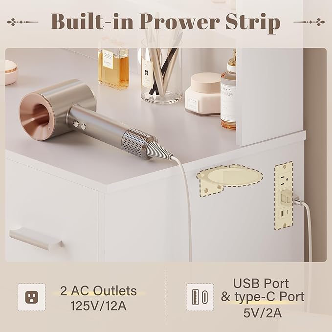 - Thoughtful and intelligent design Three open shelves on the desktop are convenient for storing commonly used skincare products, perfume and cosmetics, etc., which is more convenient to put in and out at hand. On the side of the table, there is a hair dryer holder and a built-in socket with two AC outlets, one usb port and one type-c port. You can charge your cell phone and other electronic devices while blowing your hair.