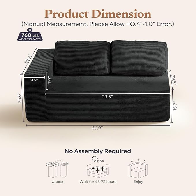 - No Assembly Required: Enjoy effortless setup with our modular sofa that arrives ready to use. Simply unbox the compact modules, gently fluff the cushions to restore their springiness, and let them expand in a well-ventilated and dry space. While full plumpness develops naturally within 24-72 hours, you can immediately enjoy cloud-like comfort