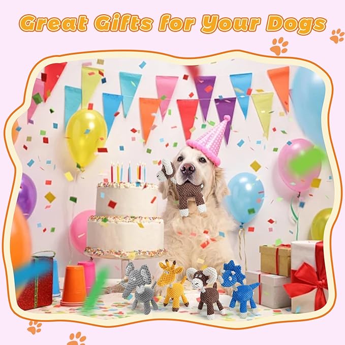 - Squeaky Puppy Toys Pack: Fun 4 pieces of 8 inch animal stuffed dog toys, including Giraffe dog toy, Dinosaur plush toys, Cute cow puppy chew toy and Elephant dog toy. These plush animal toys are designed as dog chewing toys, ideal for interactive play with squeaky features.