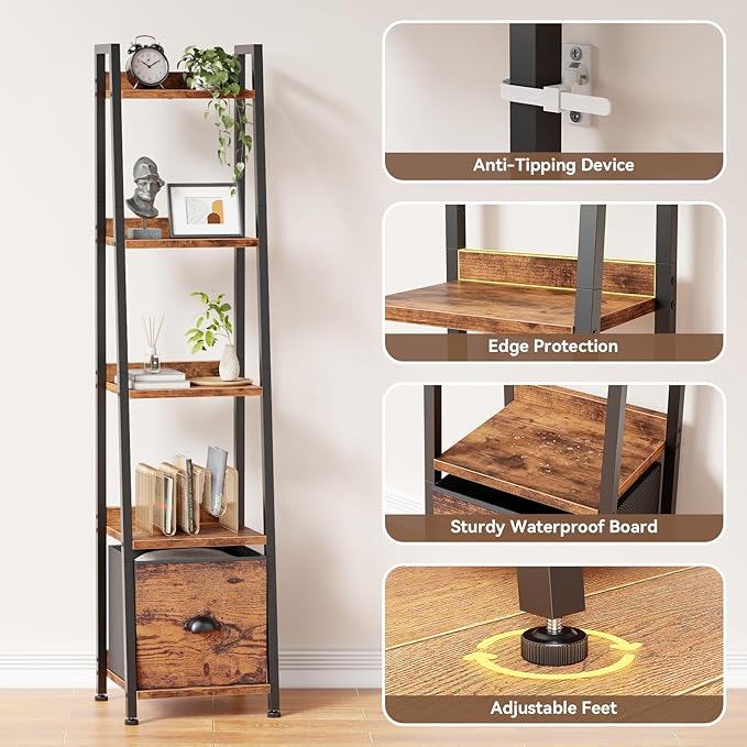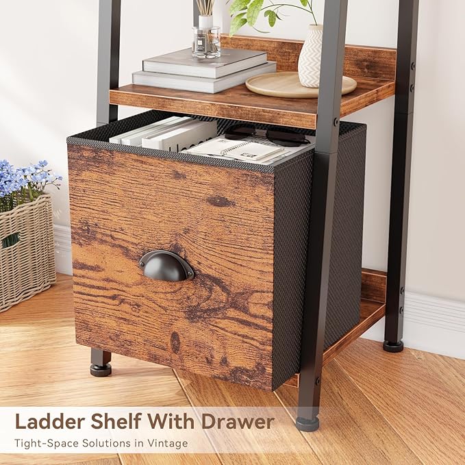 Furologee 5 Tier Narrow Ladder Shelf, Ladder Bookshelf with Drawer, Industrial Shelves Storage Rack Organizer,Skinny Display Shelving Units for Living Room,Bedroom, Kitchen,Rustic Brown