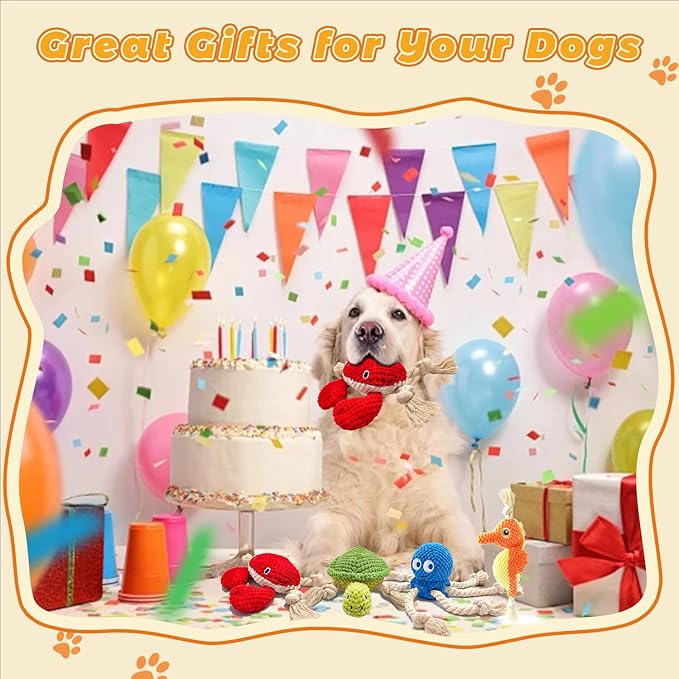 - Ocean-Themed Dog Toys Pack: Fun set of 4 sea stuffed squeaky plush dog toys (8 inches each) featuring a squid dog toy, crab puppy toy, seahorse plush, and sea turtle crinkle chew toy. Perfect squeaky dog toys for small, medium, and large dogs, Fun sea-themed dog toys to keep your dog busy, durable & safe for Puppies.