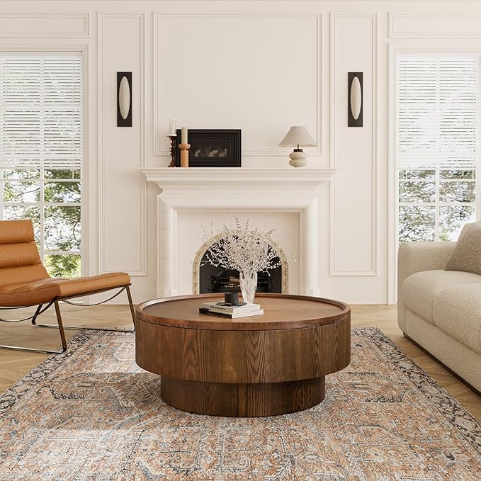 Round Coffee Table with Storage 30.7'' Modern Luxury Circle Drum Coffee Tables Farmhouse Rustic Wood Coffee Table Circle Pedestal Center Table for Living Room Apartment (Brown)