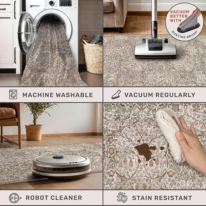 - Vintage Botanical Elegance: Inspired by 19th-century textiles, this area rug features a lush botanical pattern with timeless charm. Shades of moss green, earthy brown, muted gold, and soft rose blend in graceful symmetry, creating a tapestry-like surface that feels intricate yet serene. Flourishing vines, blooming florals, and delicate foliage recall Victorian elegance, while subtle earthy undertones bring warmth, sophistication, and heritage beauty to living rooms, bedrooms, or studies