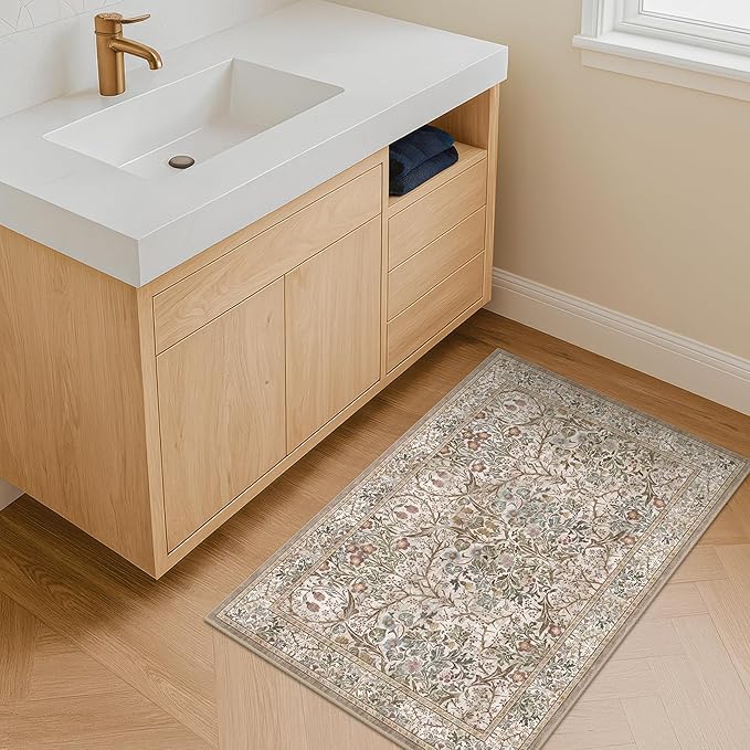 Moss Green Washable 2x3 Entry Rug - Front Door Rugs Indoor, Vintage Floral Style Small Rug for Kitchen, Bathroom, Non-Slip Boho Vintage Dark Taupe Entryway Décor
