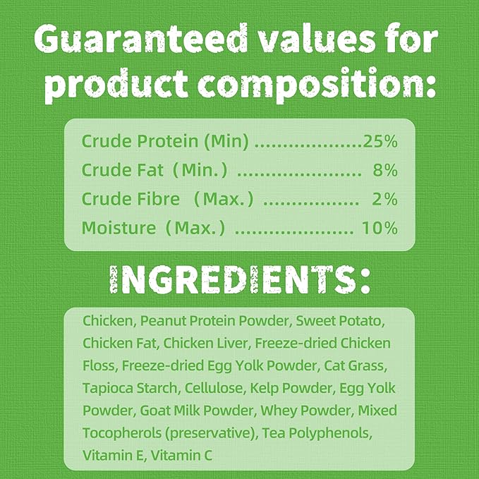 - Digestive Support & Hairball Relief: These healthy cat treats blend cat grass treats with savory chicken floss to create a dual-action snack. The natural fiber aids hairball relief for cats while lean protein supports overall health. Perfect as crunchy hairball treats for cats or crumbled as cat food toppers for extra nutrition and digestion support.