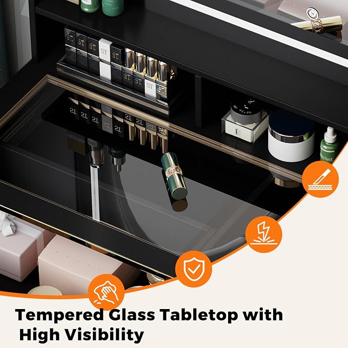 - 【Modern and Stylish Design】 Featuring a premium glass top to display your cosmetics elegantly, spacious display cabinet for organization, oversized mirror for flawless application, and angled drawers for modern appeal – all crafted with high-end materials for lasting style and durability.