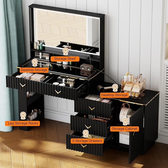 57“Makeup Vanity Desk with Mirror and Lights, Vanity Desk with 5 Drawers & Storage Shelves, Vanity Table with Power Outlet, 3 Color Modes & Adjustable Brightness Dressing Table, Bedroom,Black