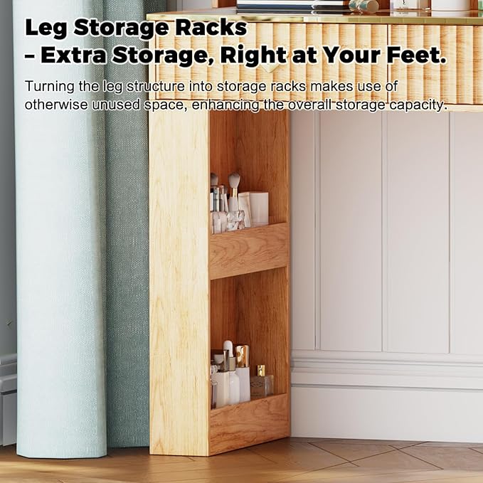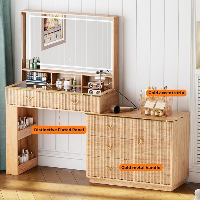 - 【Modern and Stylish Design】 Featuring a premium glass top to display your cosmetics elegantly, spacious display cabinet for organization, oversized mirror for flawless application, and angled drawers for modern appeal – all crafted with high-end materials for lasting style and durability.