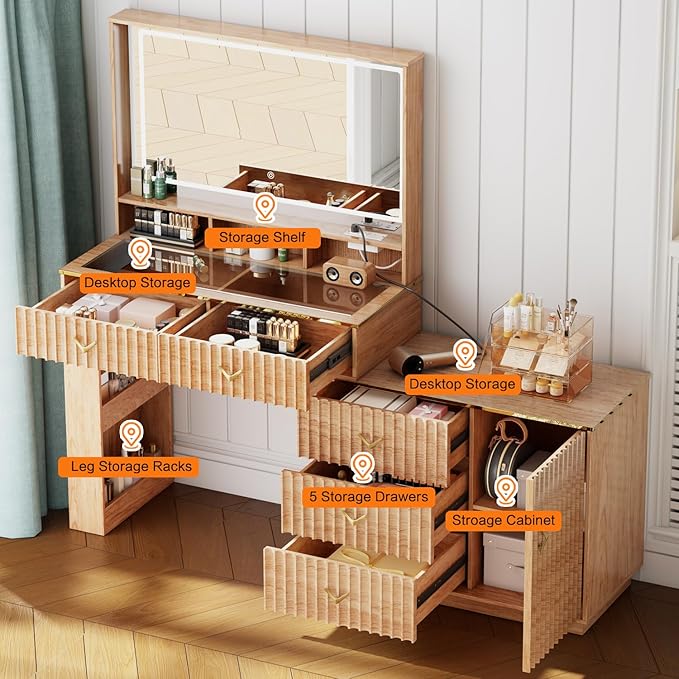 57“Makeup Vanity Desk with Mirror and Lights, Vanity Desk with 5 Drawers & Storage Shelves, Vanity Table with Power Outlet, 3 Color Modes & Adjustable Brightness Dressing Table, Bedroom,Oak