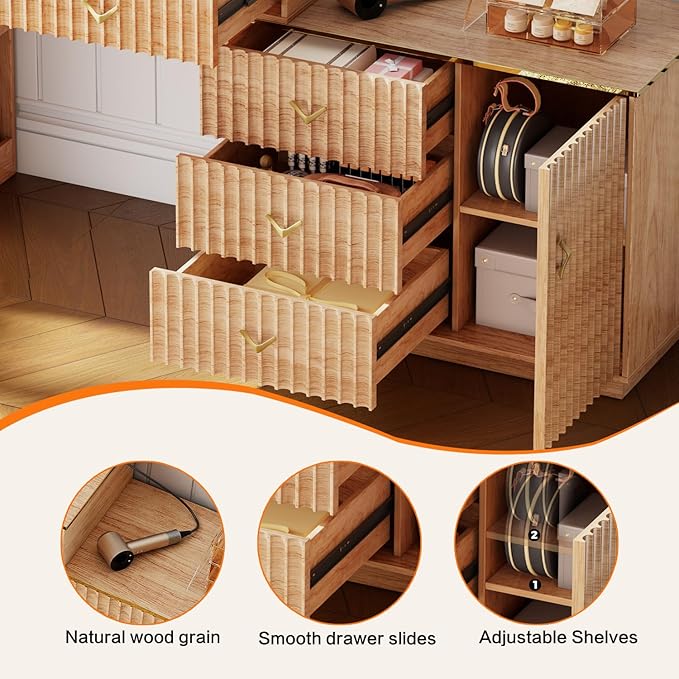 - 【Simple and Delicate Appearance Design】The large rectangular cosmetic mirror provides a wider view and makes makeup easier, the gold handles and elegant oak appearance are simple, elegant and stylish.This vanity desk with mirror and lights can perfectly match your other furniture and add magic and fashion charm to your room