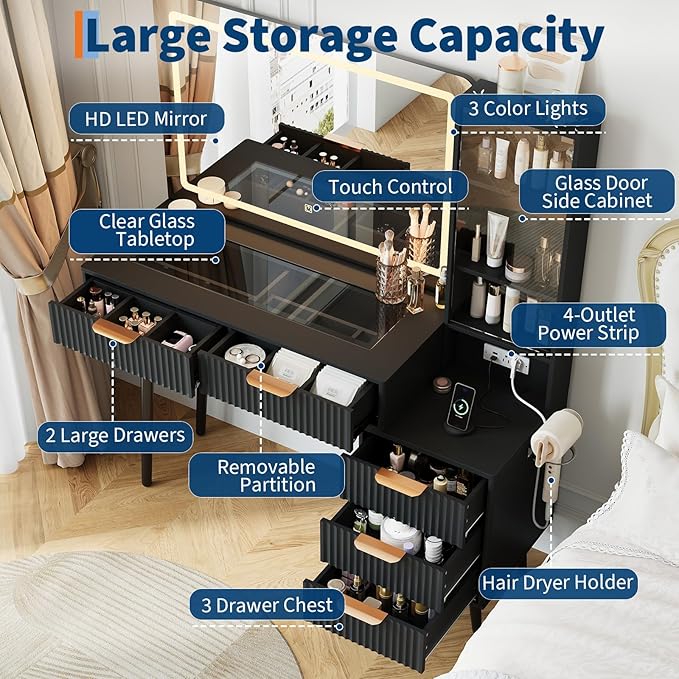 - 【Spacious Visual Glass Top & Open Shelves】Discover the ultimate in organization and style with the GarveeHome makeup vanity, which boasts a expansive GLASS TABLETOP that provides a clear view into the drawers below. This visual feature helps you quickly locate essentials while maintaining a sleek, clutter-free appearance. Additionally, this 3-Tier Glass-Door Shelf elegantly displays frequently used cosmetics, perfumes, or accessories.