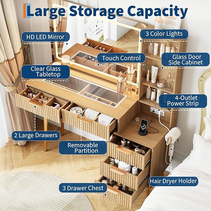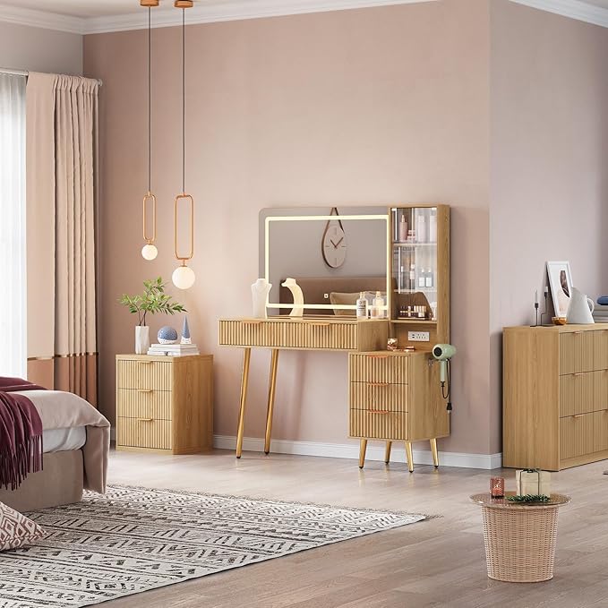 GarveeHome Fluted Makeup Vanity Desk with Lights, 48 in Big Vanity with Glass Top and Large 36" HD Lighted Mirror, Modern Dressing Table with 5 Drawers 3-Tier Shelves Set w/Charging Station (Oak)