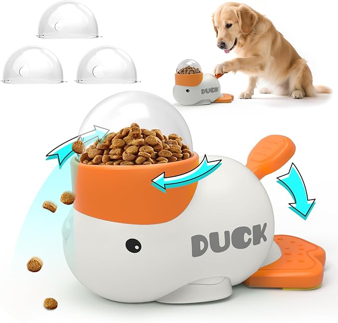 - 【Slow Feeder】This dog treat dispenser toy can be used to activate the rotating food box by pressing the duck's tail, which will randomly release some food, which can effectively slow down the dog's eating speed, reduce bloating and promote healthy digestion.