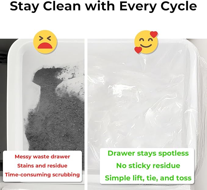 - Spotless Waste Drawer, Zero Scrubbing: Transparent litter robot liners that keep the waste drawer clean and odor-free. Simply lift, tie, and toss β no more scrubbing or dealing with messy cat litter box cleanups.