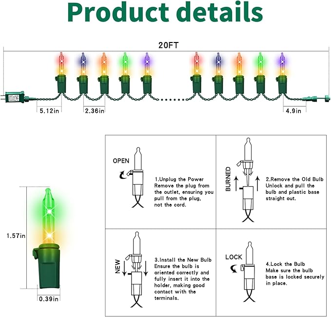 - Colorful Lighting Magic Features 100 unique frosted glass bulbs that elegantly glow. Seamlessly switch between cozy Warm White and vibrant Multicolor (Red, Blue, Orange, Green, Purple) modes to effortlessly create the perfect ambiance for any occasion.