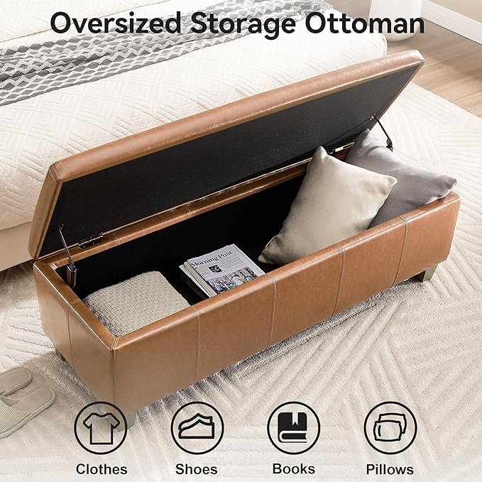 - PREMIUM MATERIALS: Our storage ottoman crafted with premium faux leather and sturdy wooden leg, high elasticity sponge filling the seat cushion, which is waterproof and wear-resistant, this ottoman ensures stability, comfort, and long-lasting quality.