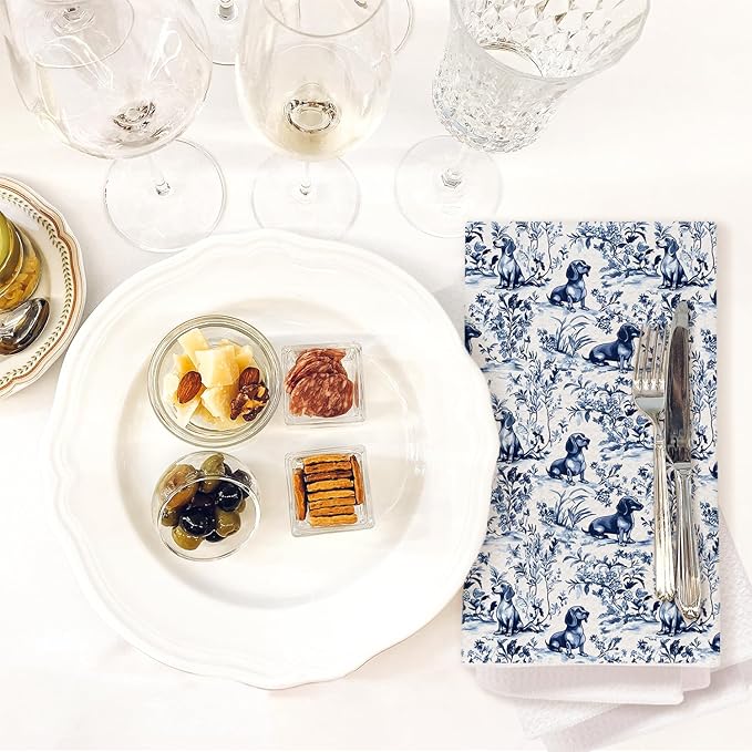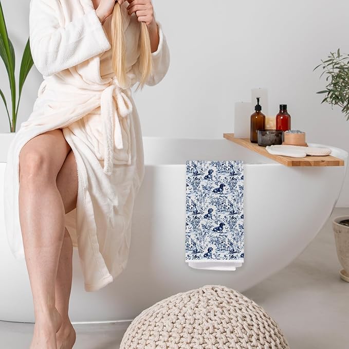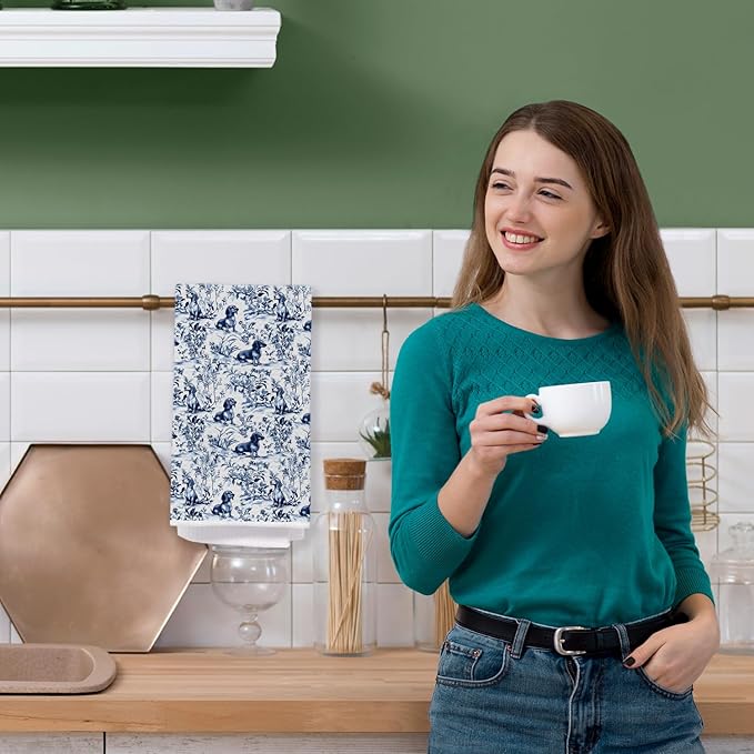 Blue Chinoiserie Dachshund Kitchen Towels, Gifts for Dachshund Lovers, Blue and White Sausage Weiner Dog Dish Tea Towels, Grandmillennial Doxie Dog Hand Towel for Bathroom Kitchen, 16x24 Inch