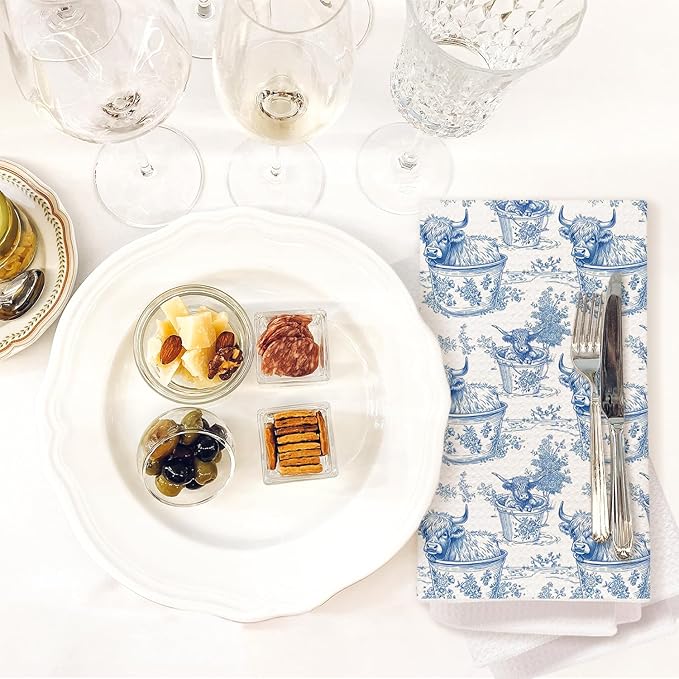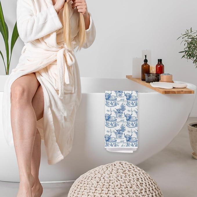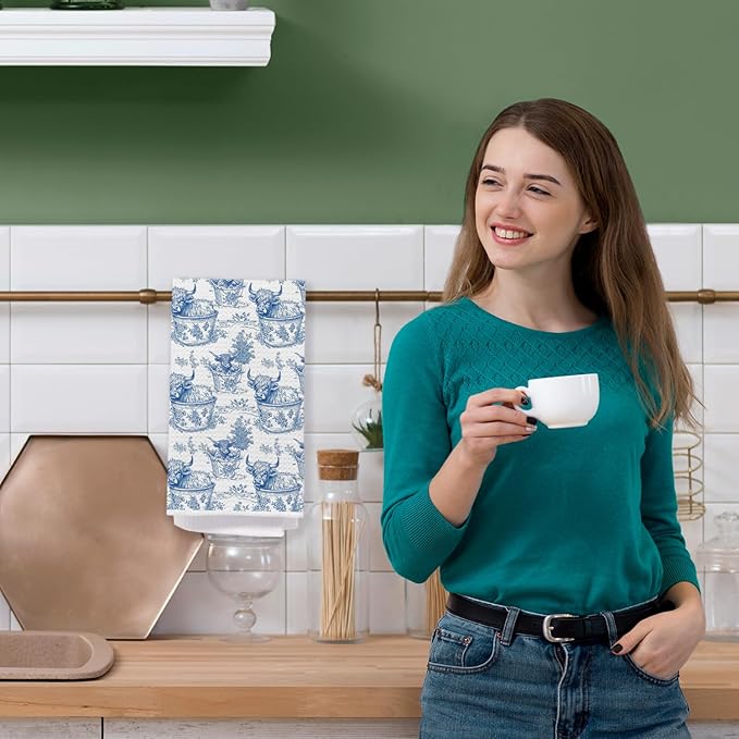 Blue Chinoiserie Highland Cow Kitchen Towels, Blue and White Grandmillennial Highland Cow Dish Tea Towels, Toile de Jouy Farm Animal Decorative Hand Towel for Bathroom Kitchen, 16x24 Inch
