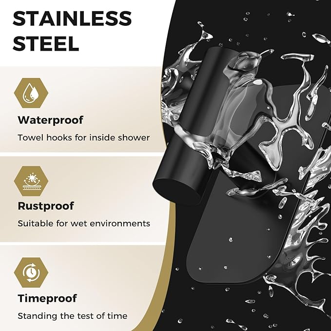 Adhesive Towel Hooks for Shower,Waterproof Heavy Duty Bathroom Hooks,Wall Mounted Sticky Hangers for Coats/Aprons/Robes,No Drilling(Black,4 Pack)