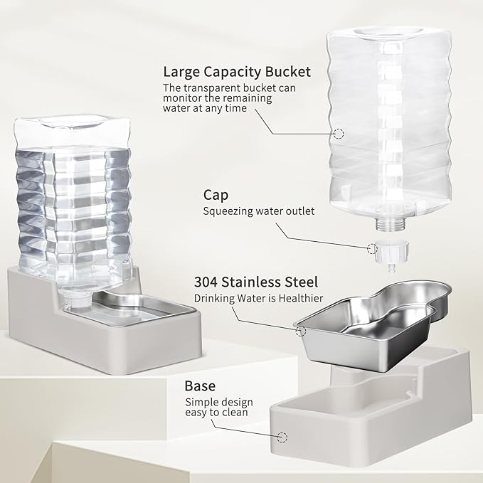 - Gravity Feed & Automatic Refilling: The efficient gravity-feed design ensures that the stainless steel bowl automatically refills to the optimal water level as your pet drinks. This prevents spills, and the proper water level also allows your pet to drink in a more comfortable position. With continuous hydration without the need for daily refills, you'll never have to worry about your pet running out of water while you're away.