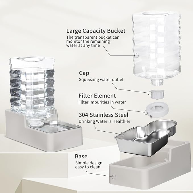 - Gravity Feed & Automatic Refilling: The efficient gravity-feed design ensures that the stainless steel bowl automatically refills to the optimal water level as your pet drinks. This prevents spills, and the proper water level also allows your pet to drink in a more comfortable position. With continuous hydration without the need for daily refills, you'll never have to worry about your pet running out of water while you're away.