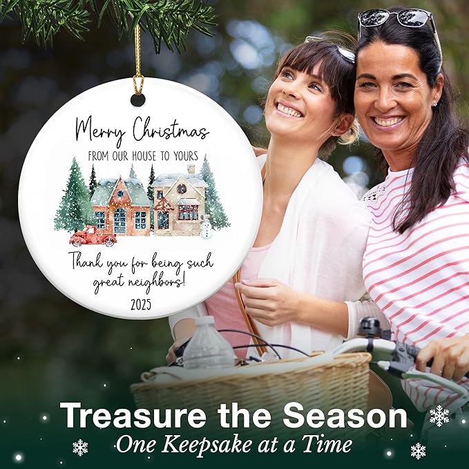 - SUPERIOR CRAFTSMANSHIP – CERAMIC KEEPSAKE ORNAMENT Expertly handcrafted from high-quality ceramic, this christmas ornament for neighbor boasts a smooth finish and vivid, festive designs. Built to last as a good neighbor Christmas ornament, it’s lightweight, durable, and offers enduring beauty. A perfect addition to best neighbor ever gifts or christmas gifts for a neighbor collections.