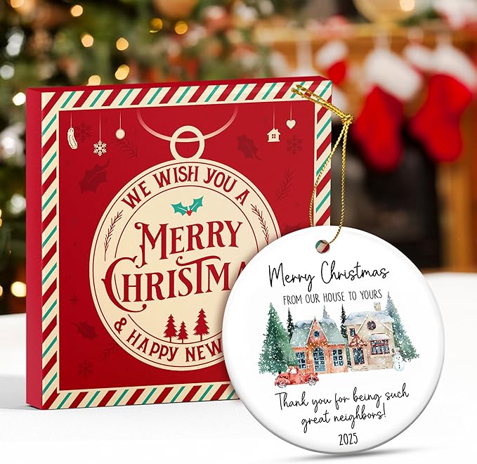 - WHAT’S IN THE ORNAMENT SET – GIFT-READY FOR CHRISTMAS Each set features one Round Ceramic neighbor ornament for christmas, complete with matching ribbon and elegant gift box. Enjoy a smooth unboxing experience—this good neighbor ornament is always gift-ready for a surprise delivery, Christmas morning, or a neighbor’s holiday party. Make your neighbor’s day extra special with this unique holiday gift!