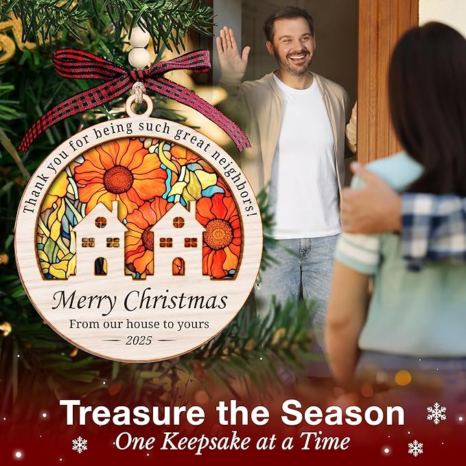 - SUPERIOR CRAFTSMANSHIP – WOOD & ACRYLIC KEEPSAKE ORNAMENT Expertly handcrafted from high-quality wood and acrylic, this christmas ornament for neighbor boasts a smooth finish and vivid, festive designs. Built to last as a good neighbor Christmas ornament, it’s lightweight, durable, and offers enduring beauty. A perfect addition to best neighbor ever gifts or christmas gifts for a neighbor collections.