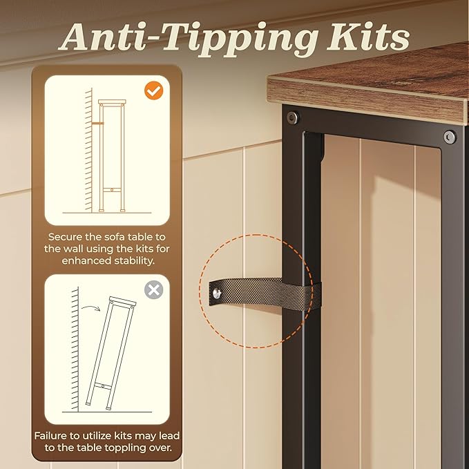 - 【Strong, Stable & Safe】Made from high-quality engineered wood and a sturdy metal frame, this behind the sofa table is built for daily use. Anti-tip kit included for wall-mount safety, plus upgraded larger adjustable feet keep it steady on uneven floors, much more stable than smaller leg bases
