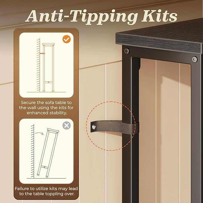 - 【Strong, Stable & Safe】Made from high-quality engineered wood and a sturdy metal frame, this behind the sofa table is built for daily use. Anti-tip kit included for wall-mount safety, plus upgraded larger adjustable feet keep it steady on uneven floors, much more stable than smaller leg bases
