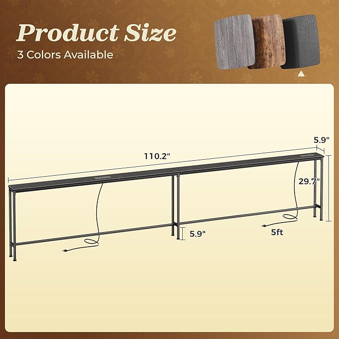- 【2 Flexible Power Strips】This long console table features 2 built-in power strips, each with 2 AC outlets, 1 USB port, and 1 USB-C port. And guess what? You can place the outlets anywhere along the narrow sofa table (except the center board) to fit your setup. Whether you're charging a laptop, phone, tablet, or game controller, you won't need to bend over or struggle with wall outlets blocked by furniture anymore