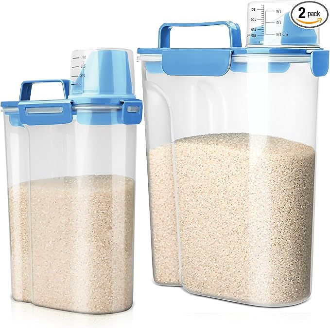 Rice Storage Container, 5 to 10lb Dry Food Airtight Dispenser, Pet Dog Cat Food Canister, BPA Free Clear Plastic Kitchen and Pantry Bin for Oatmeal, Cereal, Pasta, Flour Pack of 2 Blue